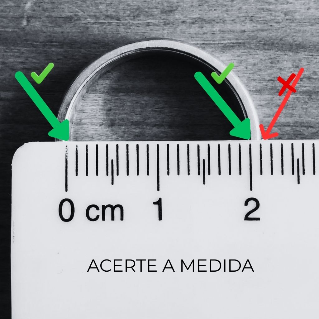 Dicas Rápidas do Especialista: * Aros Largos: Se este anel tem um aro largo (acima de 6mm), recomendamos escolher um número acima do resultado para maior conforto. * Clima e Horário: O melhor momento para medir seu dedo é ao final da tarde, quando eles estão em seu tamanho real.