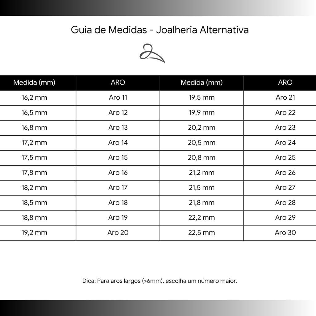 Dicas Rápidas do Especialista: * Aros Largos: Se este anel tem um aro largo (acima de 6mm), recomendamos escolher um número acima do resultado para maior conforto. * Clima e Horário: O melhor momento para medir seu dedo é ao final da tarde, quando eles estão em seu tamanho real.