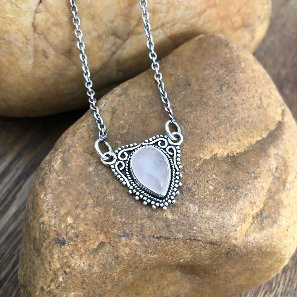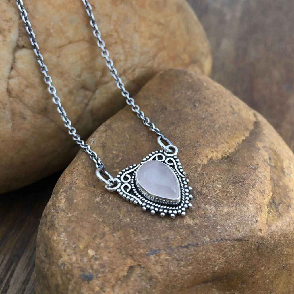 Gargantilha Quartzo Rosa Gota Indiana Prata 925