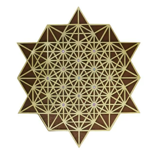 Formado por triângulos e hexágonos traz a harmonização do fogo (triângulo) e da água (hexágono), símbolo da alquimia do Rei Salomão. Promove equilíbrio entre as polaridades, entre o yin e yang, sentimento e razão.