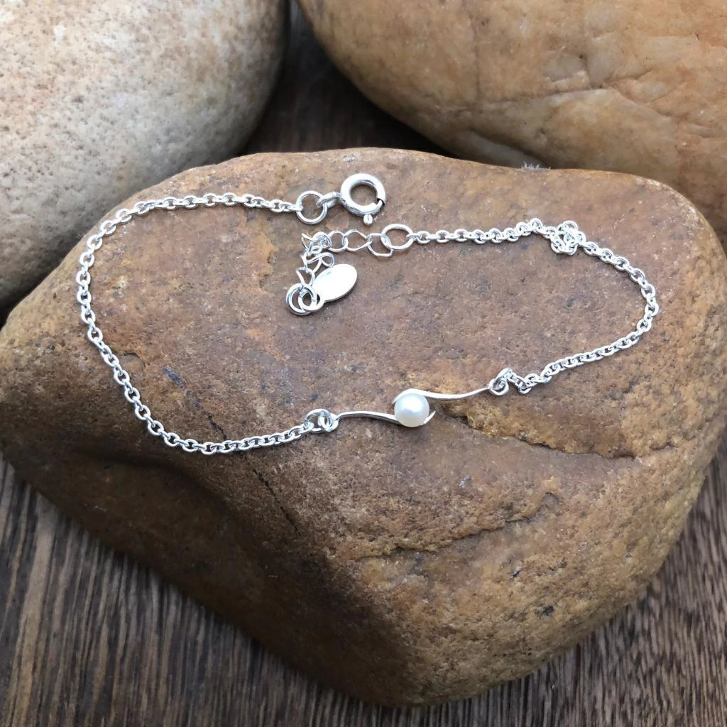 Delicadeza pura. Uma pulseira de elos Português finos com um detalhe de Pérola com Prata.
